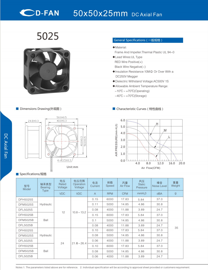 材料: 框架和葉輪:熱塑UL 94-0 引線.UL類型 紅色導線正極(+) 黑線負極(-) 絕緣電阻:10MΩ或以上,帶DC250V高阻表 介電耐壓:AC500V 1S 允許環境溫度範圍: -10℃-+70℃(運行) -40℃-+70℃(儲存)